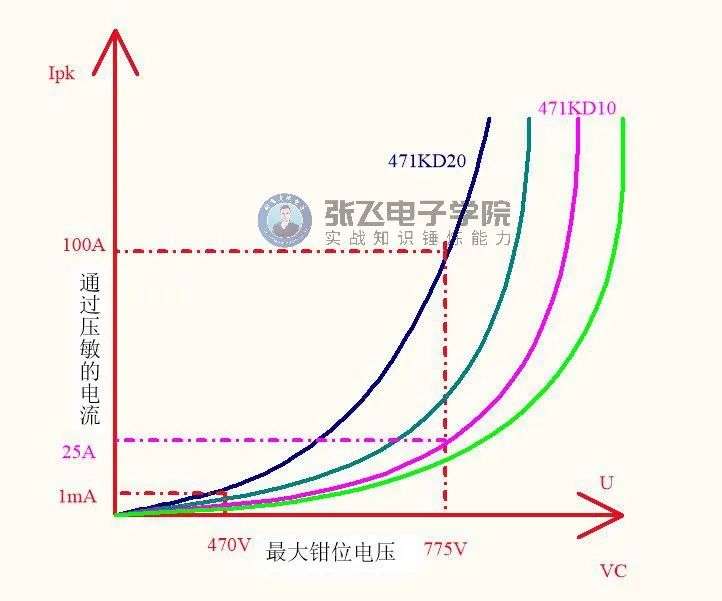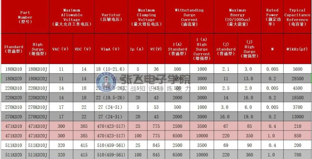 從上圖看471KD10與471KD20的數(shù)據(jù)來比較,我們可以看出允許的大交流與直流電壓都相同,但是大的鉗位電壓上面我們可以看出KD10的與KD20通過的電流時(shí)25A與100A,這說明我們在同一個(gè)電路上,打同一等級的雷擊浪涌時(shí),KD10的鉗位電壓要比KD20的高。