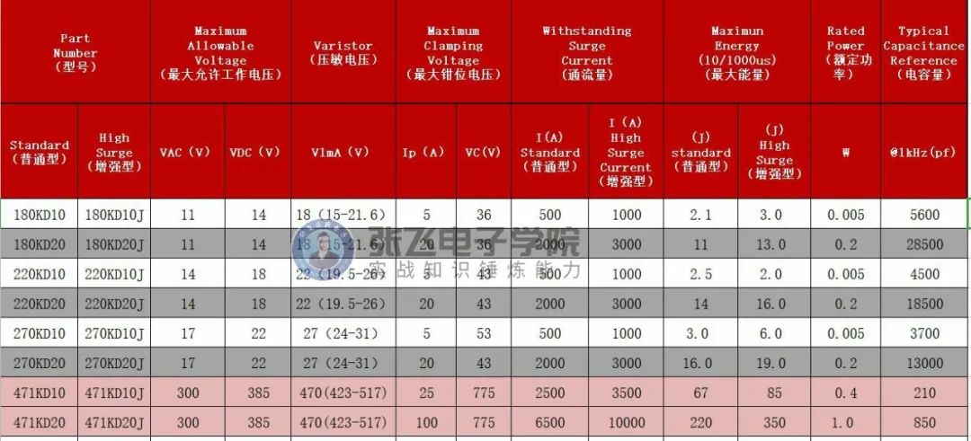 列如我們常用的471 它的大允許電壓AC300V DC385V同時(shí)通流量也是需要注意的,一般規(guī)格書上給出來的通流是1次的通流量,我們在選取的時(shí)候一定需要留有很大的余量,通流量是我們選擇直徑的依據(jù),如果一個(gè)417KD10 的壓敏電阻在計(jì)算的時(shí)候剛好接近規(guī)格書上的通流量2500A,我們可以選取兩個(gè)來并,如果空間不夠的時(shí)候我們可以選擇加強(qiáng)型的。
