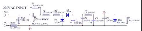 2、限流電容須接于火線,耐壓要足夠大(大于400V),并加串防浪涌沖擊兼保險電阻和并放電電阻。