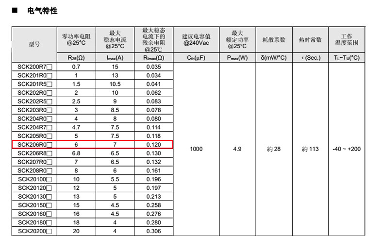 熱敏電阻: 穩騰 熱敏電阻型號: SCK206R0MSBY 熱敏電阻片徑: Φ20mm 零功率電阻@25℃: 6Ω 工作溫度范圍: -40℃±200℃ 儲存溫度范圍: -40℃±85℃