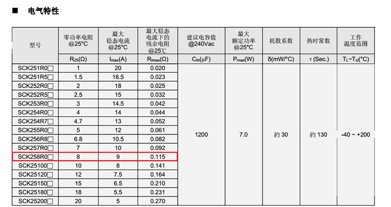 熱敏電阻: VT 熱敏電阻型號: SCK258R0MSY 熱敏電阻片徑: Φ25mm 零功率電阻@25℃: 8Ω 工作溫度范圍: -40℃±200℃ 儲存溫度范圍: -40℃±85℃