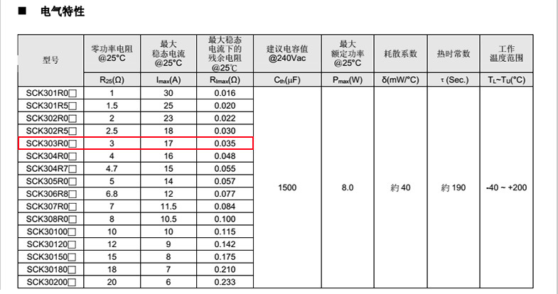 熱敏電阻: VT 熱敏電阻型號: SCK303R0MSY 熱敏電阻片徑: Φ30mm 零功率電阻@25℃: 3Ω 工作溫度范圍: -40℃±200℃ 儲存溫度范圍: -40℃±85℃